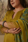 This radiant chartreuse ensemble is woven from twisted cotton-silk yarns that lend it texture and sheen. The fabric’s intricate weave catches light with every movement, with delicate organza detailing adding to the ethereal softness to the edges.