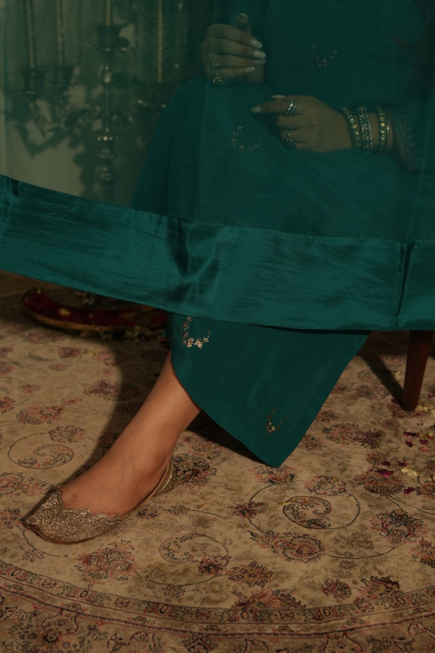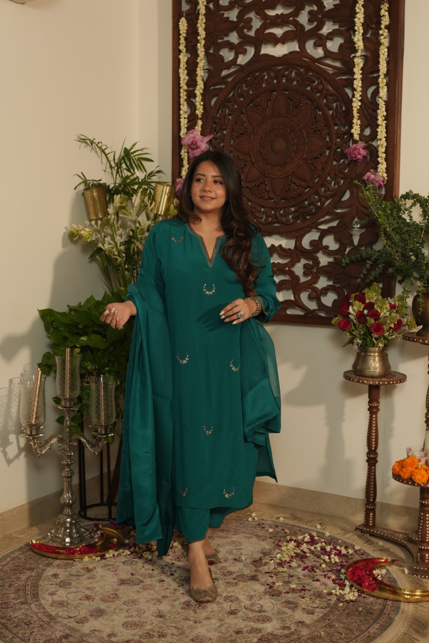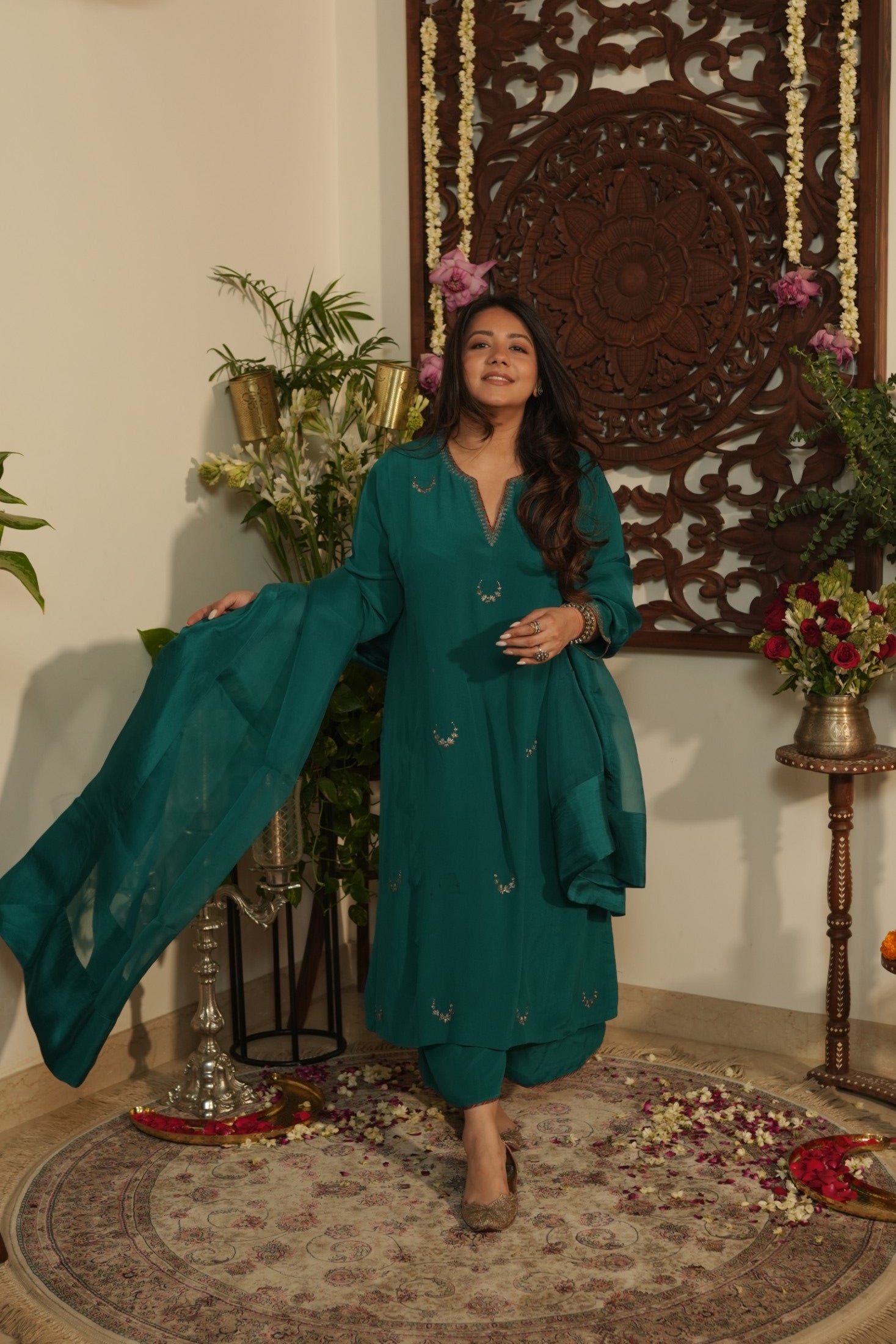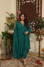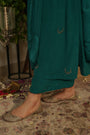 A regal teal chaand Gul ensemble crafted in pure crepe fabric adorned with delicate hand embroidered chaand motifs scattered gracefully across the silhouette. The kurta features subtle stitch & print detailing along the neckline, leading structure to its fluid drape. Paired with tapered trousers in crepe with matching organza dupatta finished with silk border. The charms lies in its understated, refined grace.