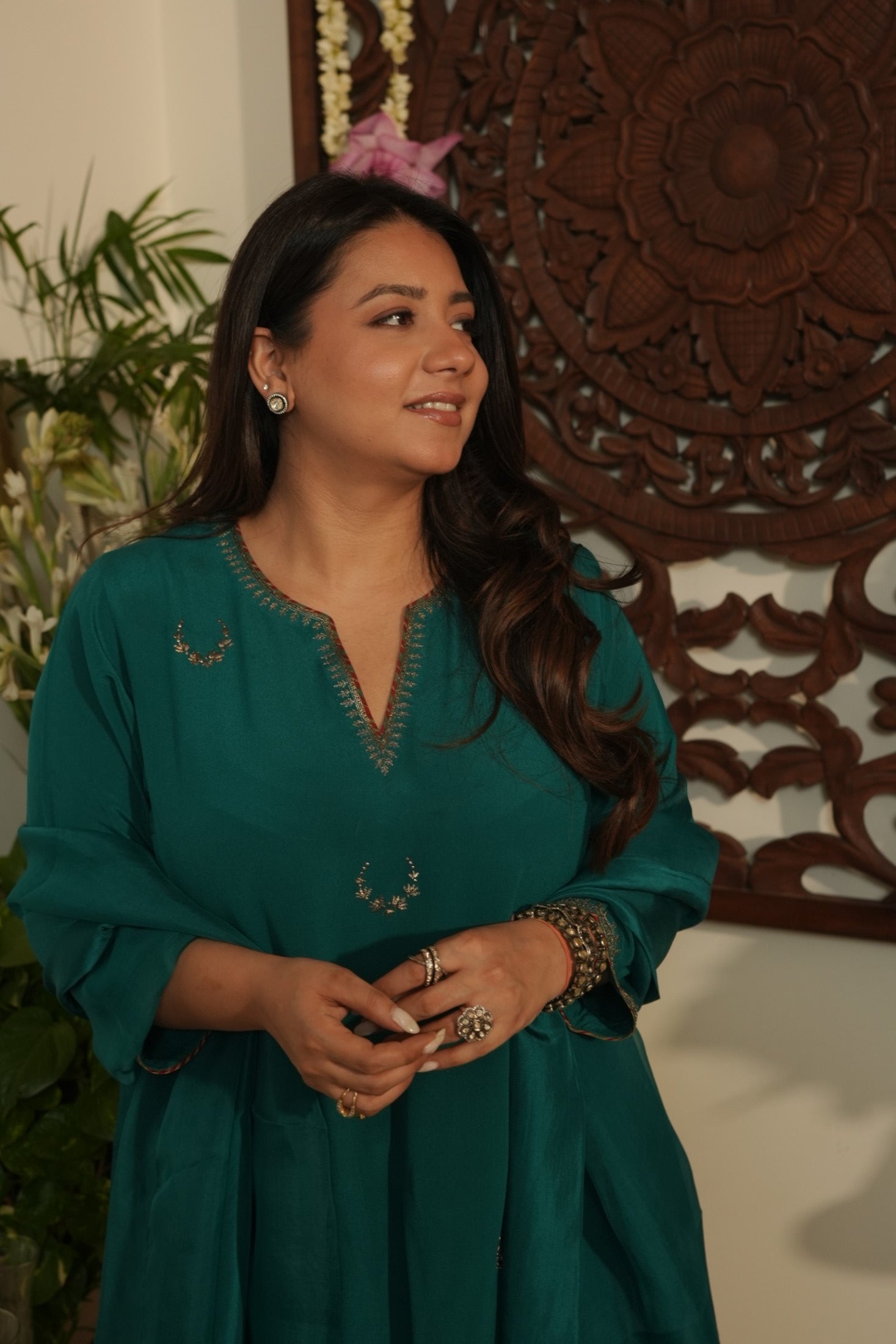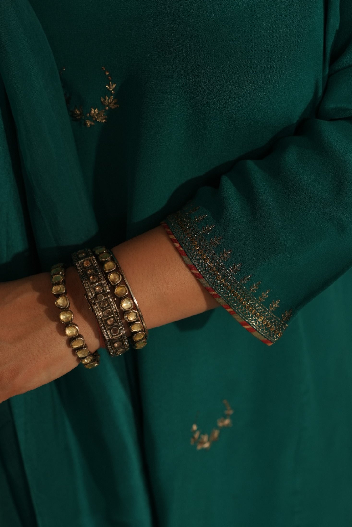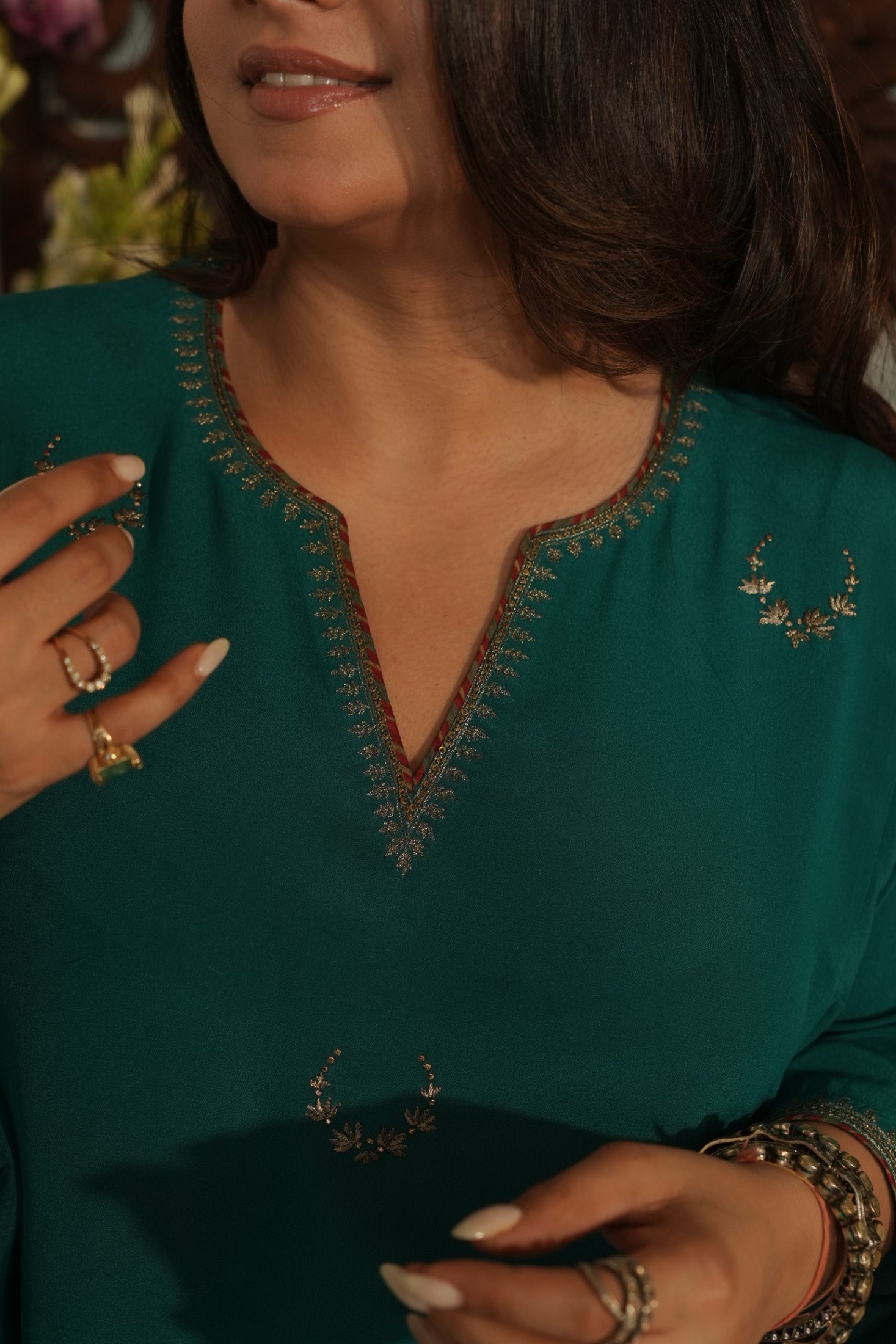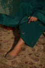 A regal teal chaand Gul ensemble crafted in pure crepe fabric adorned with delicate hand embroidered chaand motifs scattered gracefully across the silhouette. The kurta features subtle stitch & print detailing along the neckline, leading structure to its fluid drape. Paired with tapered trousers in crepe with matching organza dupatta finished with silk border. The charms lies in its understated, refined grace.