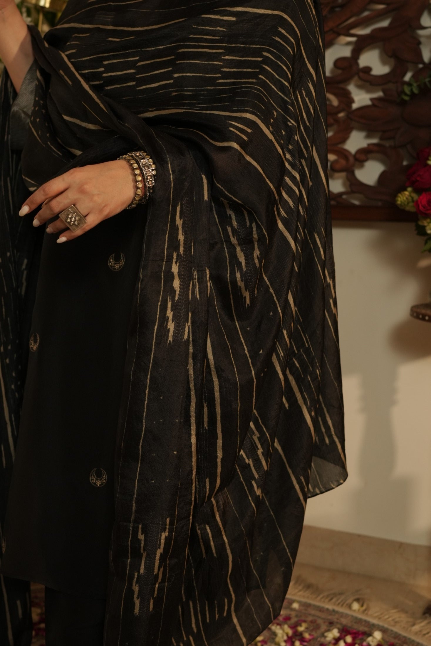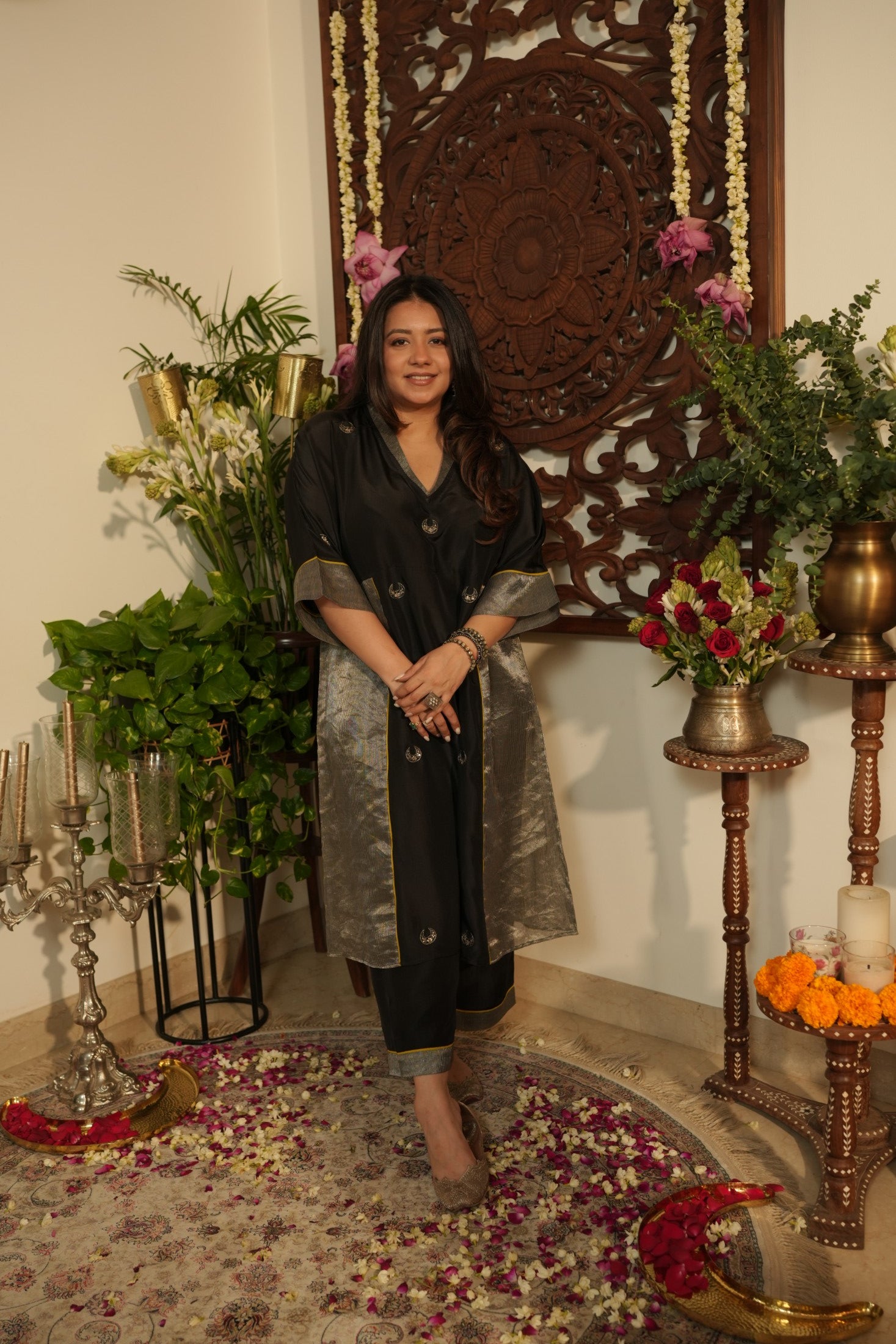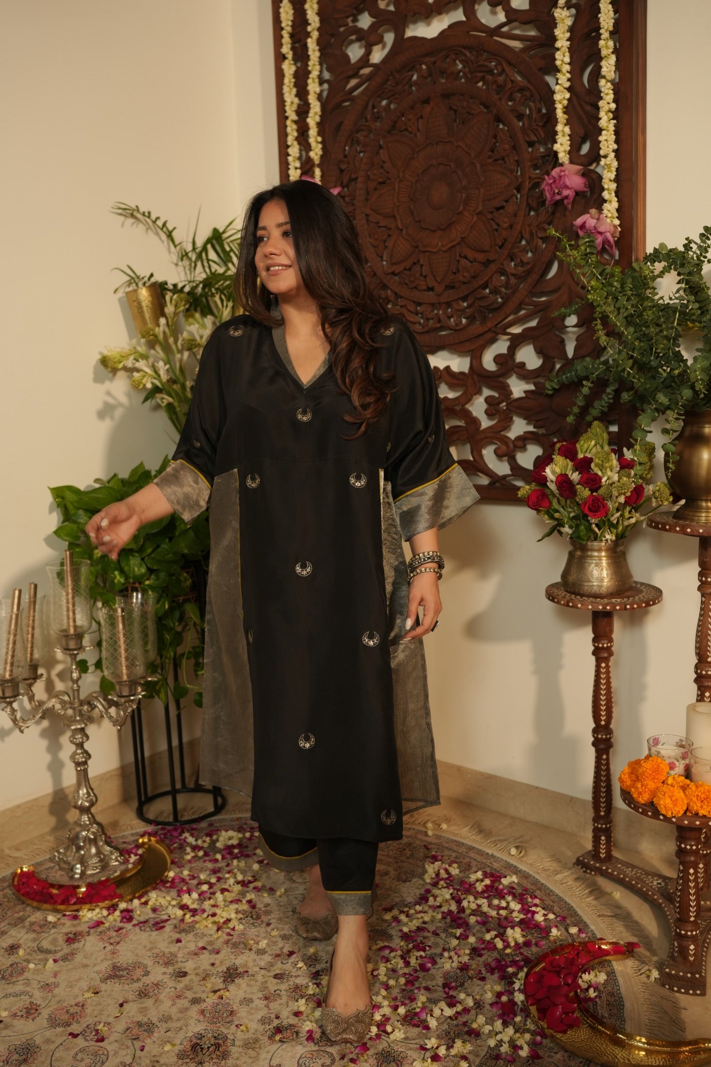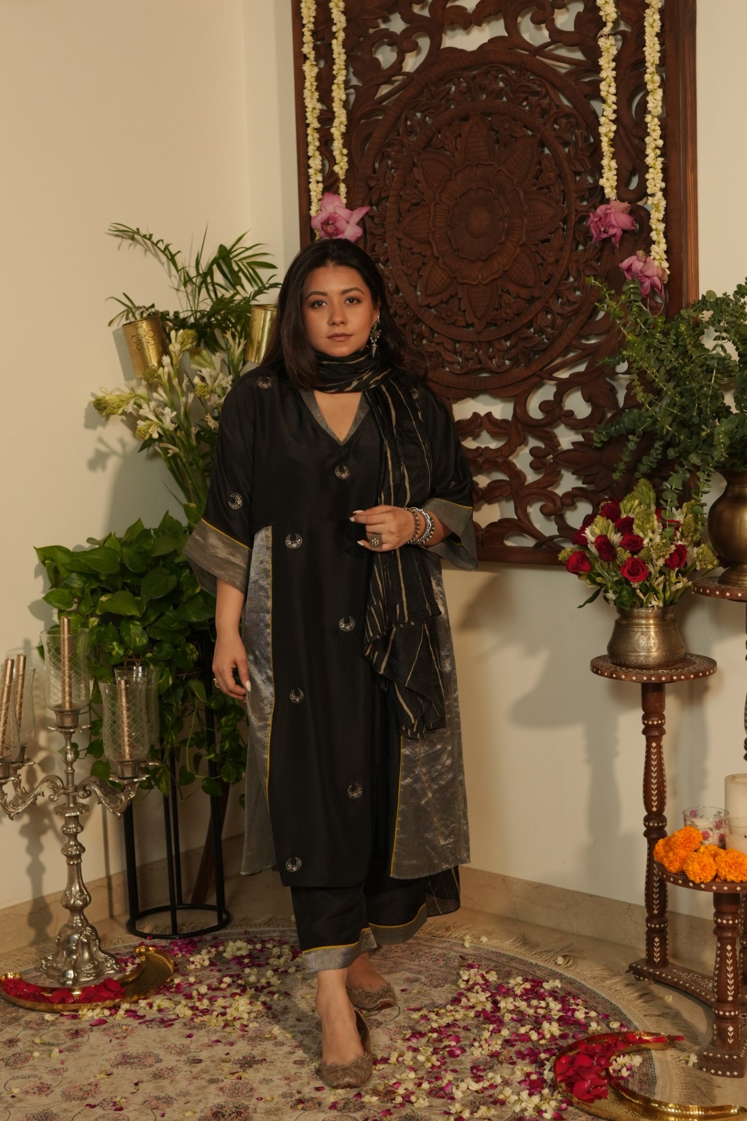 Kinnat, an elegant black silk and tissue anti-fit kurta, highlighted with delicate chartreuse detailing that lends a subtle edge to the look. The kurta is adorned with hand-embroidered chaand motifs, exuding understated charm. It is paired with coordinated silk and tissue detailed lowers and complemented by a printed tabby silk dupatta, completing the ensemble with effortless sophistication.