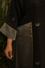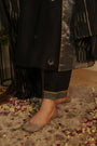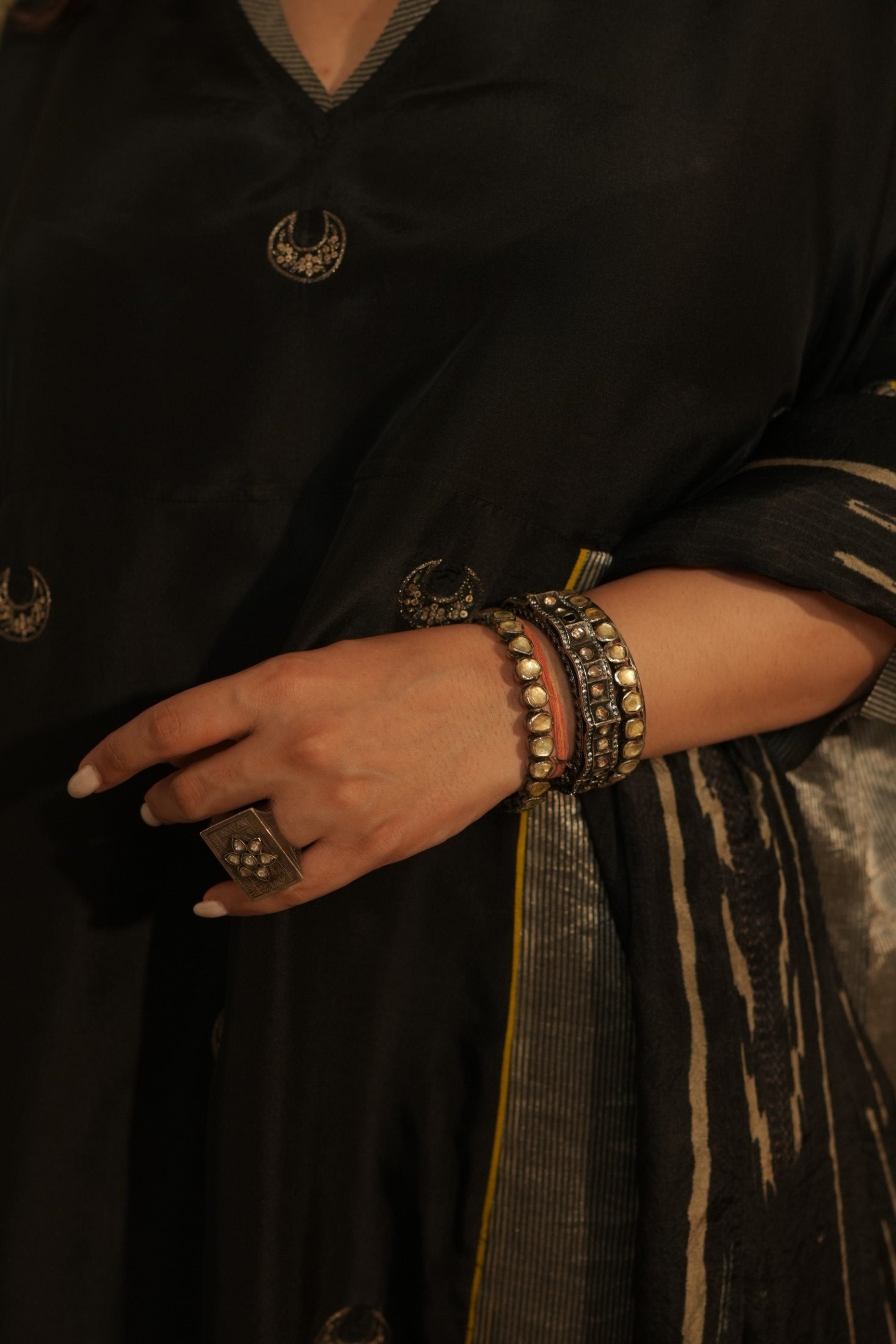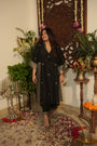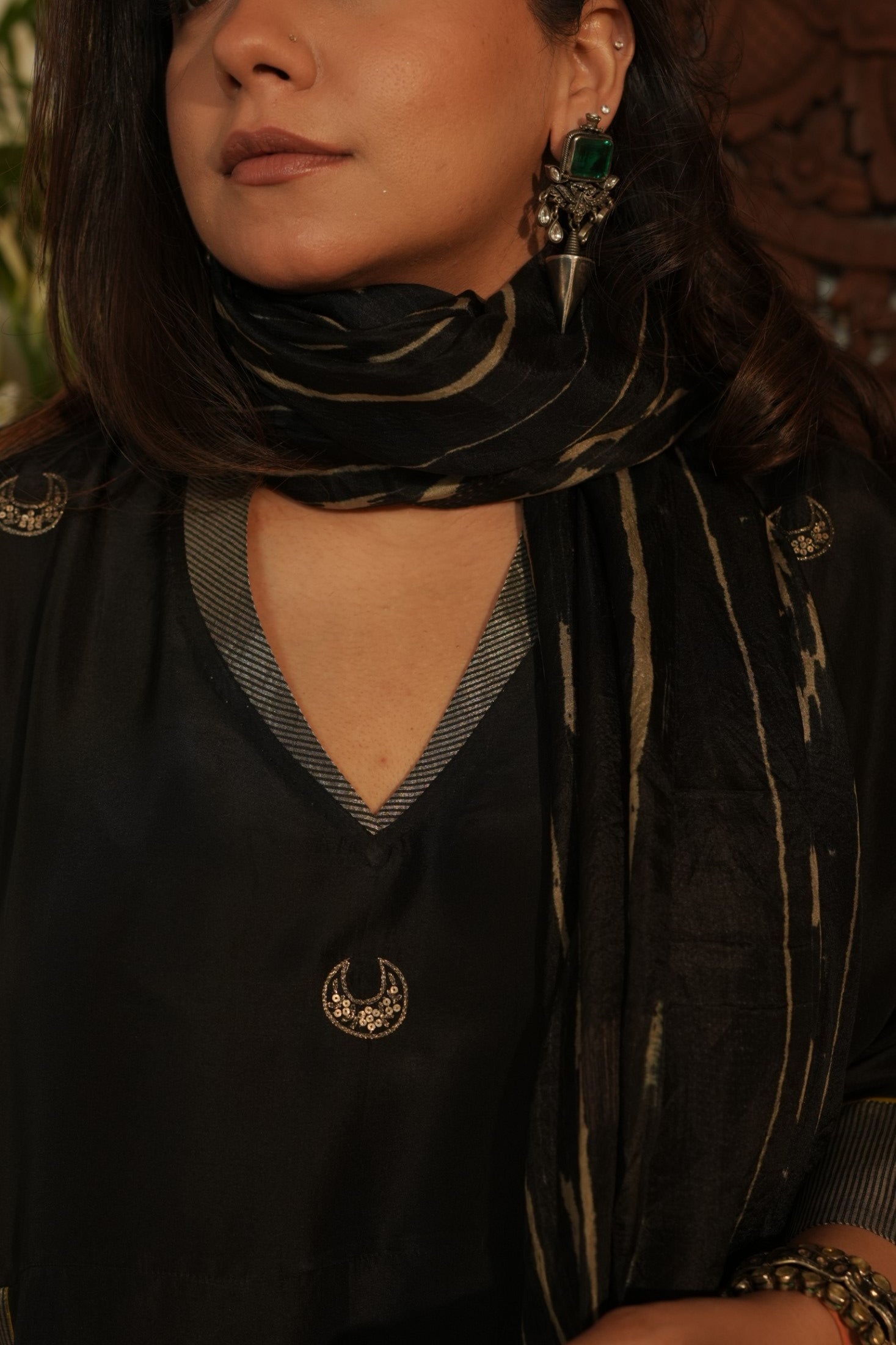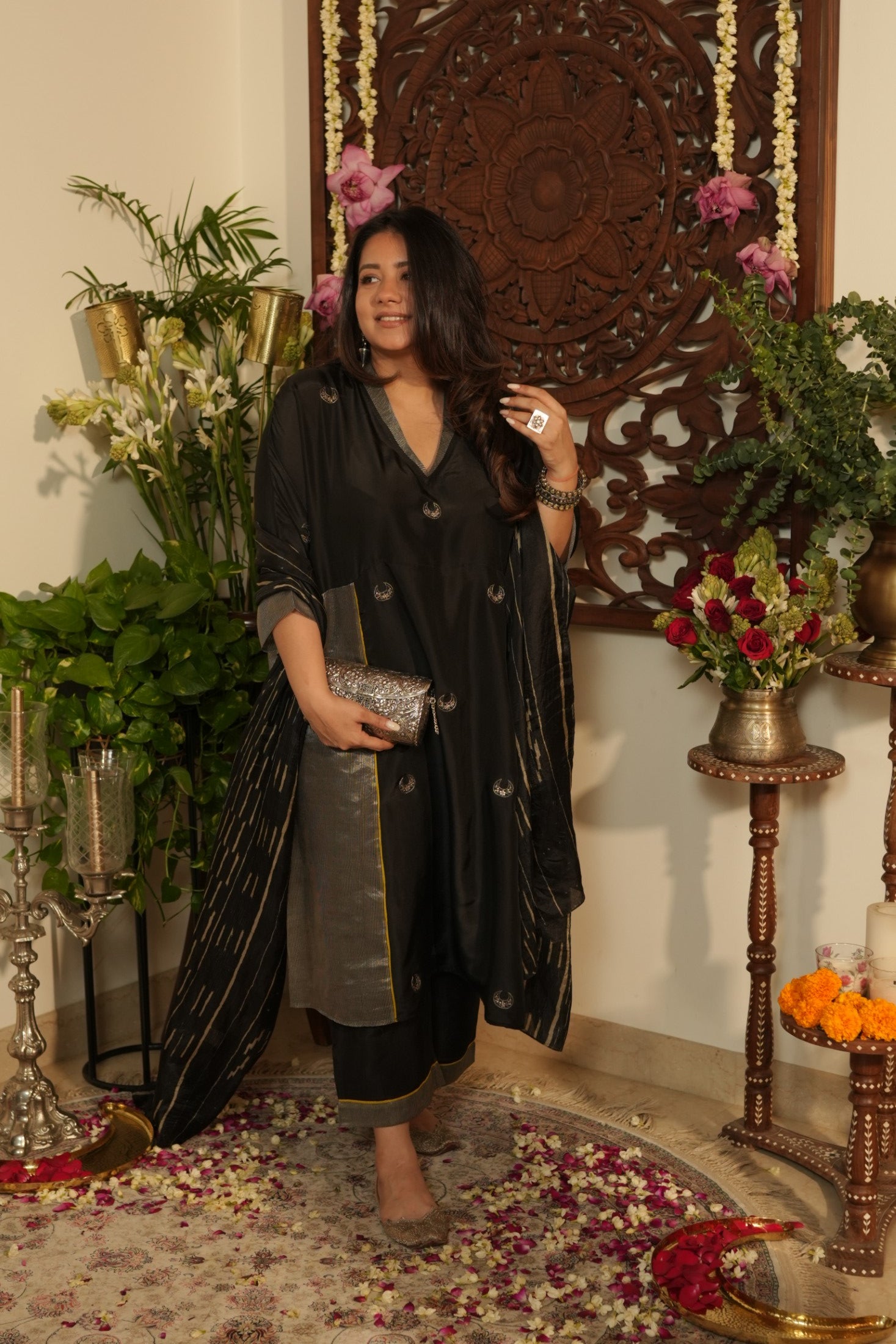 Kinnat, an elegant black silk and tissue anti-fit kurta, highlighted with delicate chartreuse detailing that lends a subtle edge to the look. The kurta is adorned with hand-embroidered chaand motifs, exuding understated charm. It is paired with coordinated silk and tissue detailed lowers and complemented by a printed tabby silk dupatta, completing the ensemble with effortless sophistication.