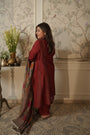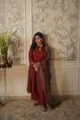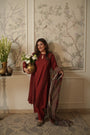 In a striking crimson hue, this ensemble blends depth & delicacy through a play of textured fabrics. The choga kurta is tailored in a rich mix of cotton- silk woven stripes and heavy chanderi, with a subtle peek of organza detailing that adds lightness to the structure. Paired with a soft cotton farshi, the look feels both rooted and refined.