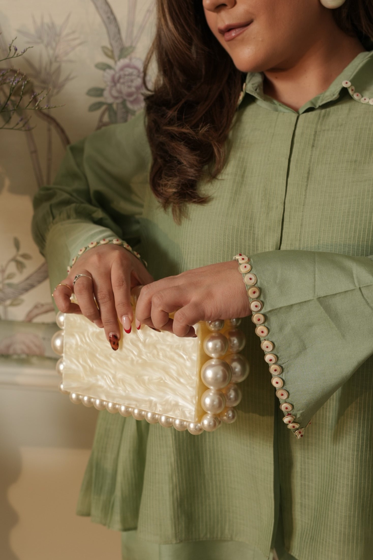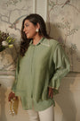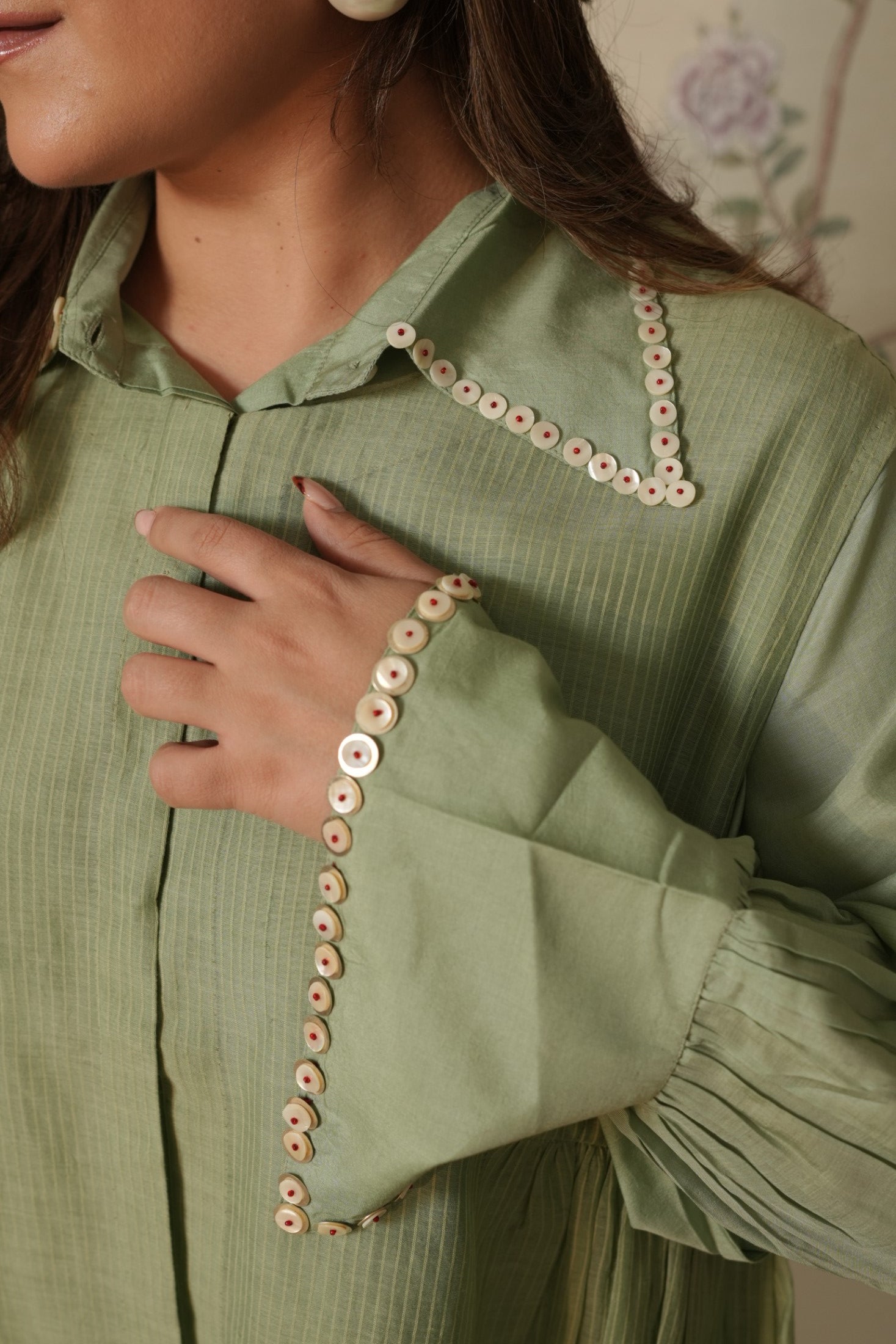 This rich cotton silk pistachio shirt paired with finely woven pinstripe chanderi shrug. The form & flow of both the pieces blending in to create an exclusive masterpiece for a head turn meeting or brunch. The ensemble is thoughtfully embellished with sequins, button & bead hand detailings.