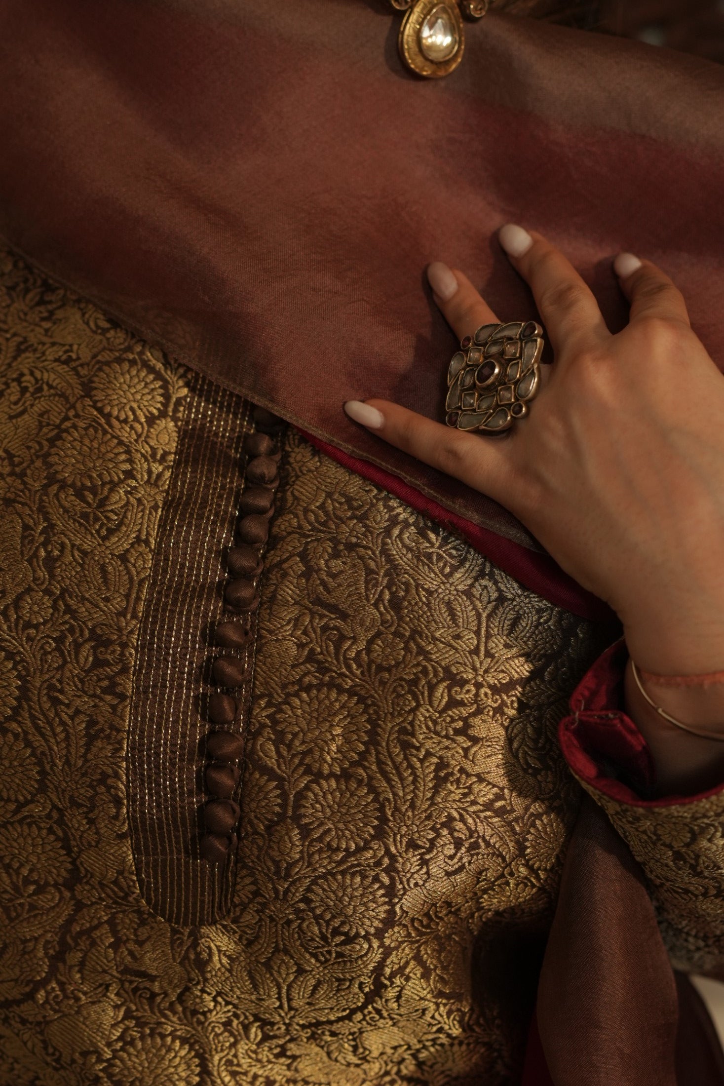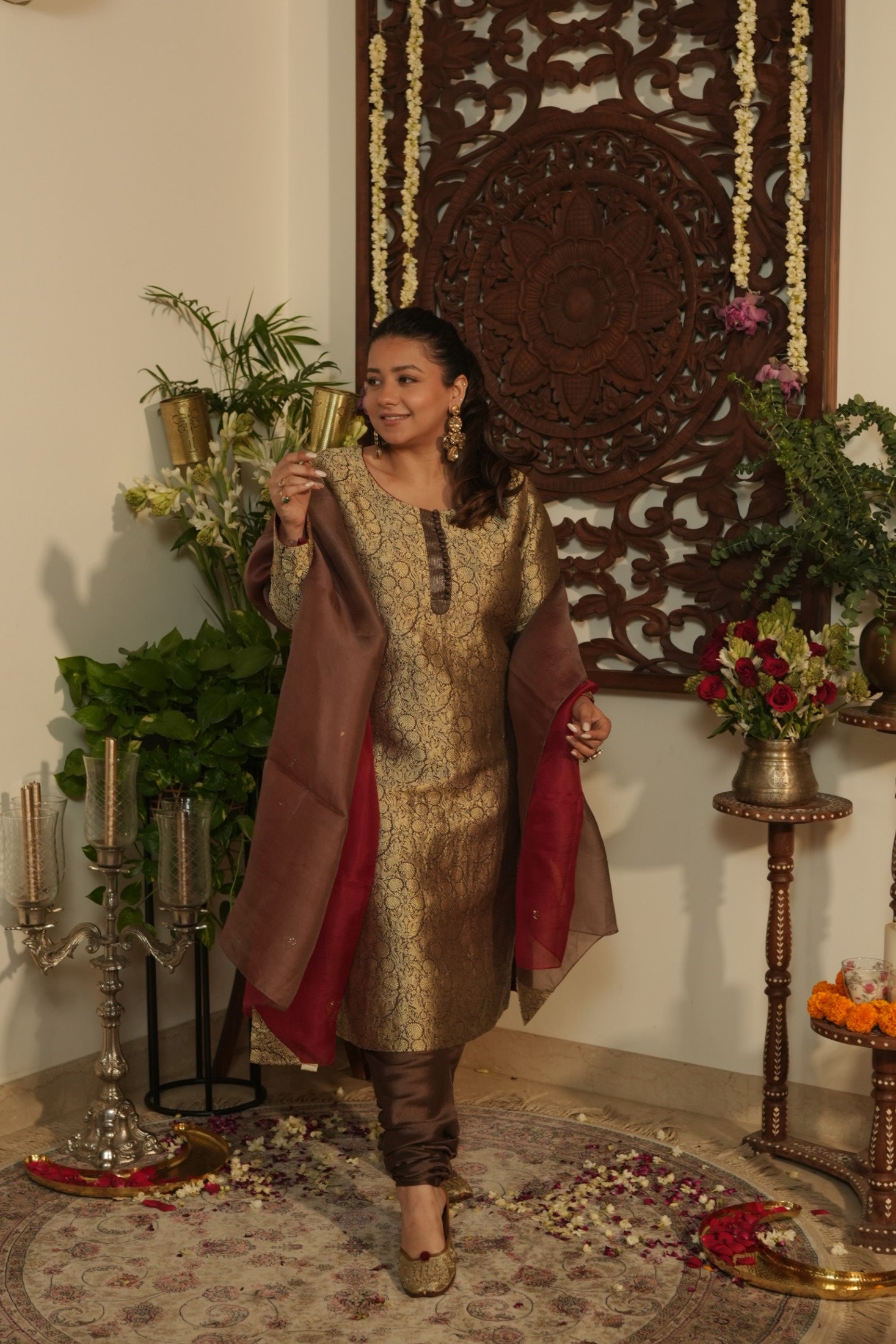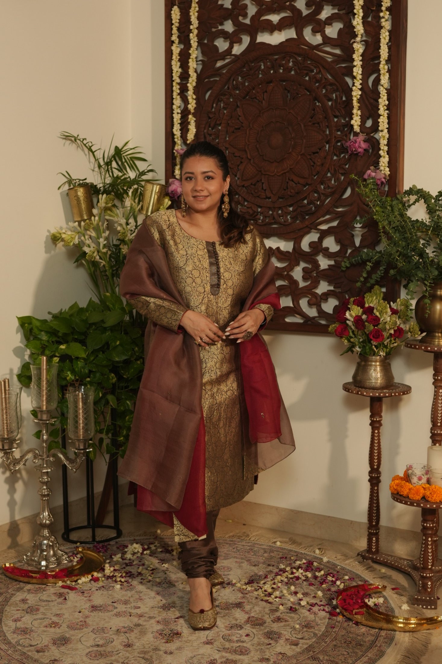Naaz celebrates of timeless elegance, this ensemble features our rich Sher-Bagh silk brocade in a deep, lustrous brown. The classic straight kurta paired with a matching churidar brings back the effortless grace of heirloom silhouettes. Adding a contemporary yet subtle flourish, the odhani introduces a gentle fission of ombré reds melting into warm browns—creating a soft pop of colour that elevates the look with refined sophistication. Perfect for intimate gatherings and festive soirées, this look is an ode to tradition, preserved and reimagined with quiet luxury.