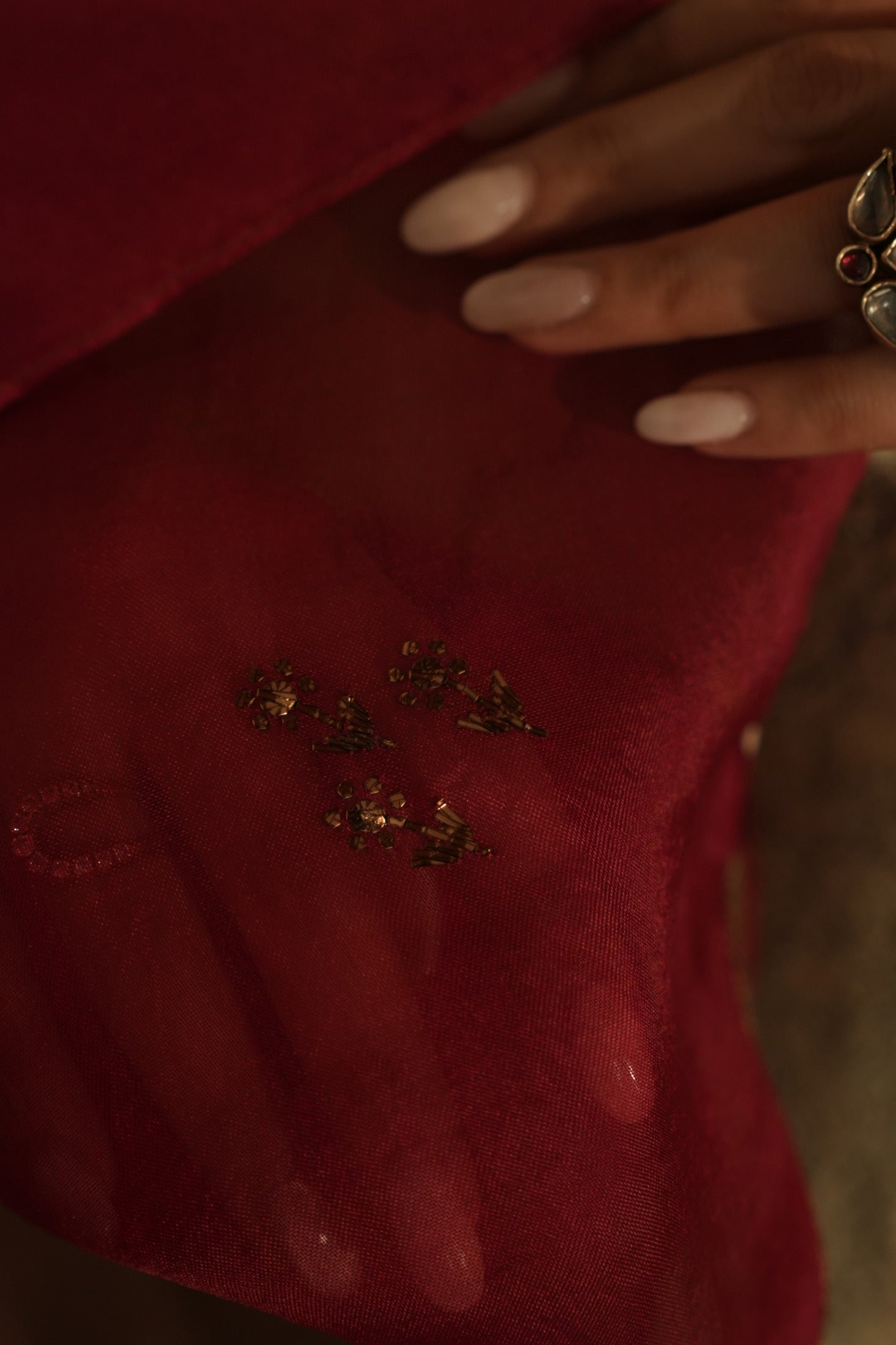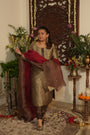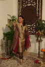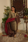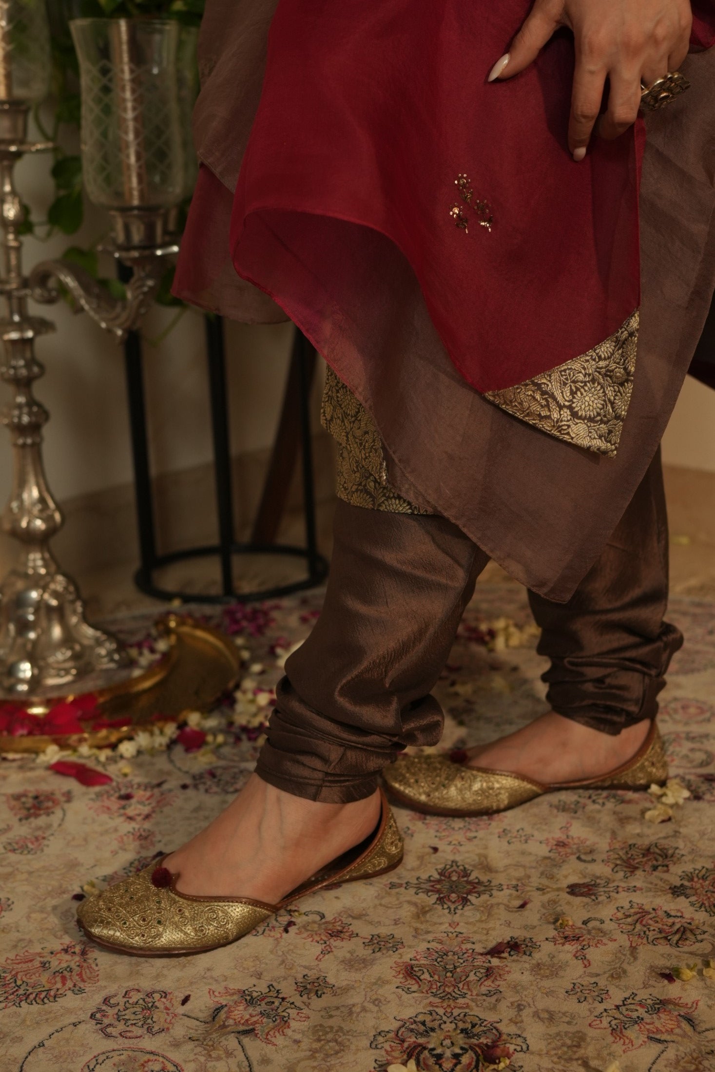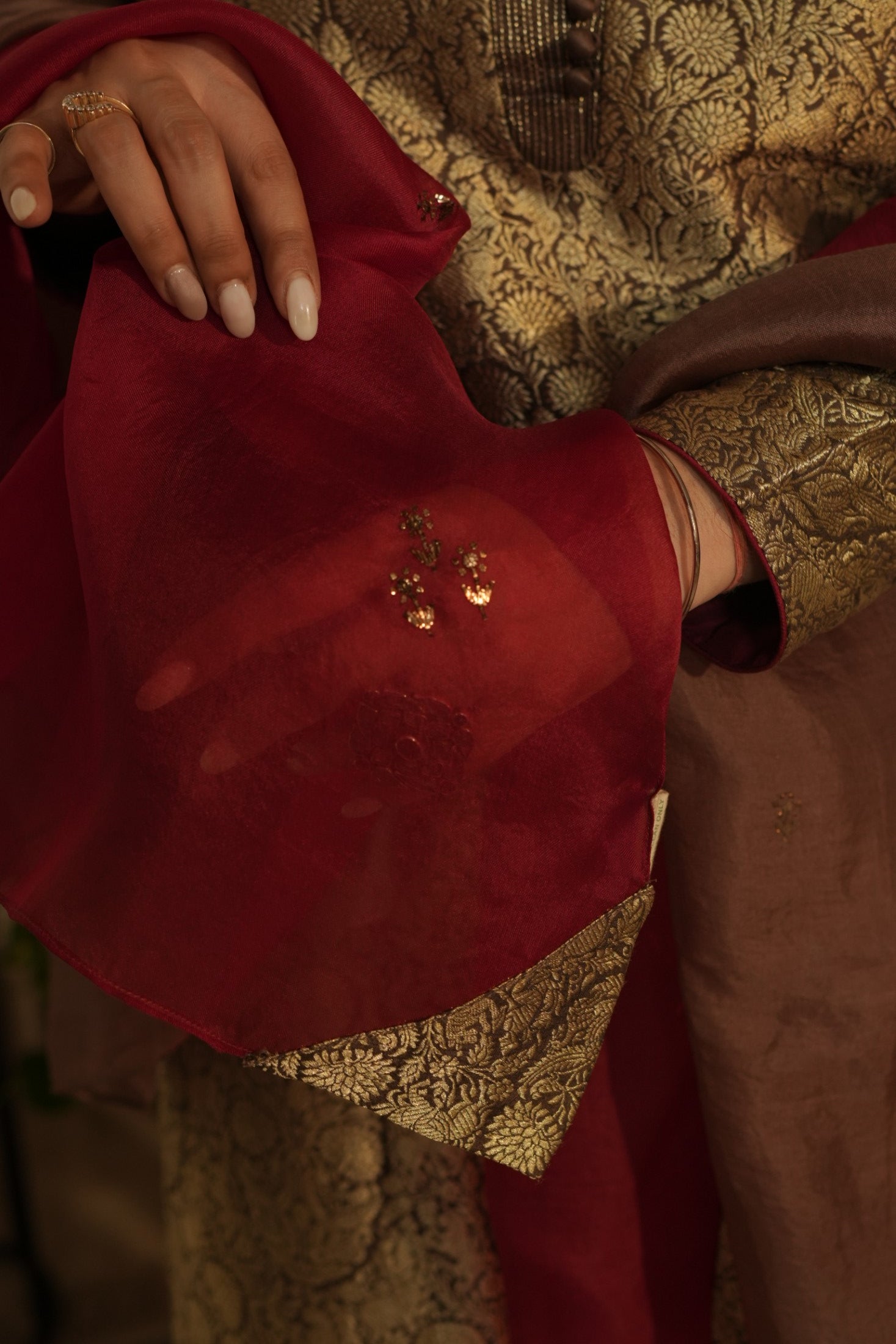 Naaz celebrates of timeless elegance, this ensemble features our rich Sher-Bagh silk brocade in a deep, lustrous brown. The classic straight kurta paired with a matching churidar brings back the effortless grace of heirloom silhouettes. Adding a contemporary yet subtle flourish, the odhani introduces a gentle fission of ombré reds melting into warm browns—creating a soft pop of colour that elevates the look with refined sophistication. Perfect for intimate gatherings and festive soirées, this look is an ode to tradition, preserved and reimagined with quiet luxury.
