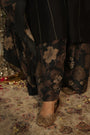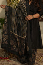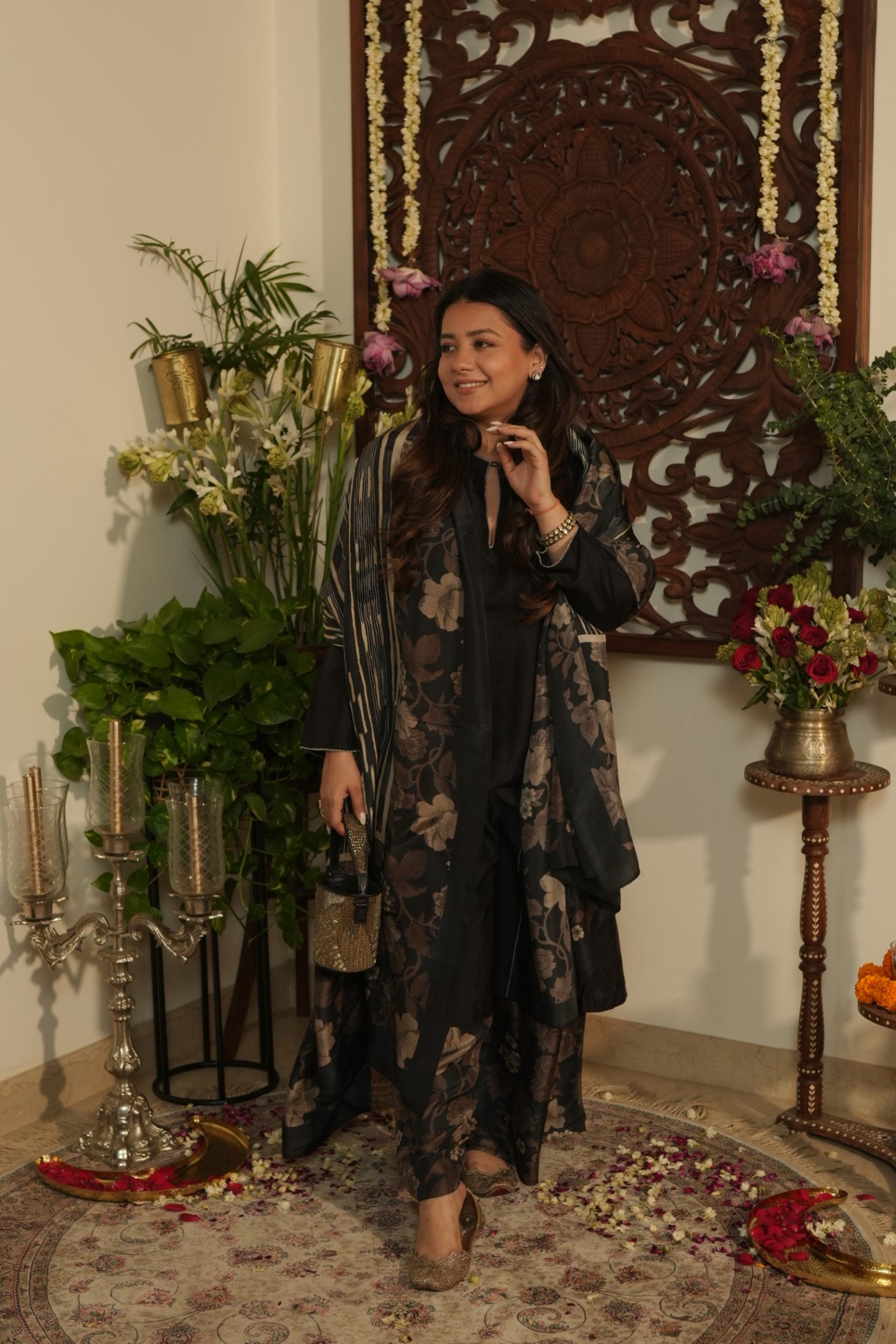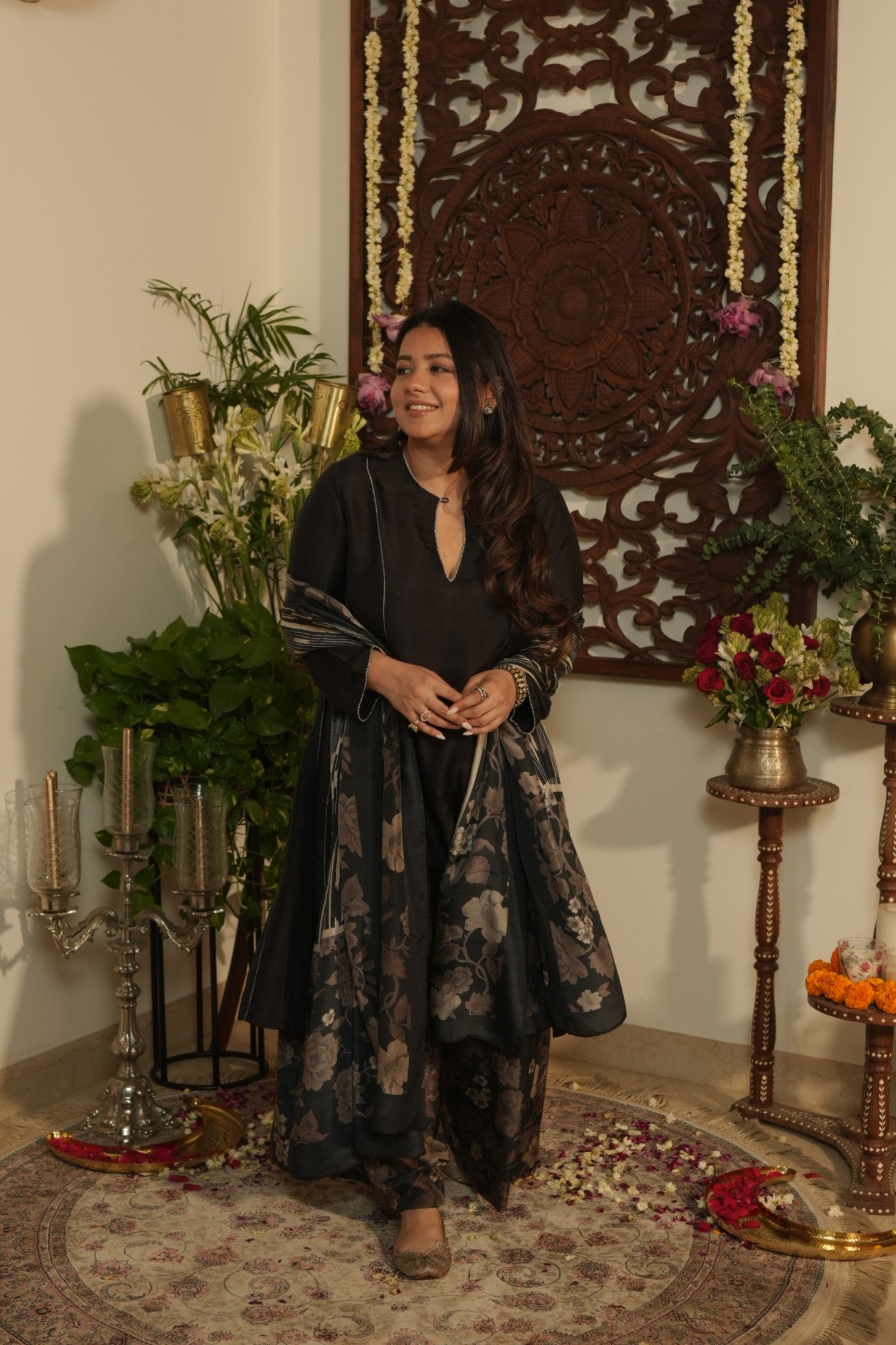 Niyab ensemble, a solid black silk kurta in a flowing, easy silhouette, accentuated with delicate stitch detailing that adds subtle texture and refinement. It is paired with a luxurious printed silk farshi-style lower featuring an elegant floral jaal and complemented by a beautifully crafted matching printed silk dupatta. Together, the ensemble strikes a perfect balance between understated sophistication and timeless charm.