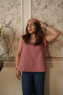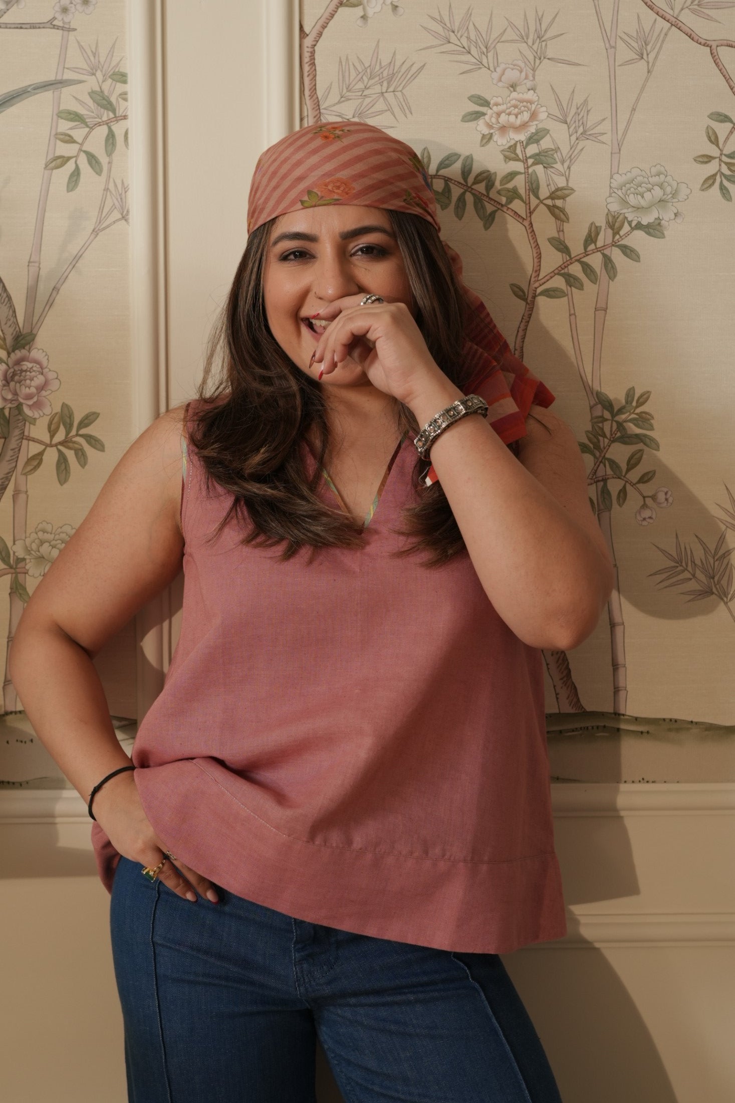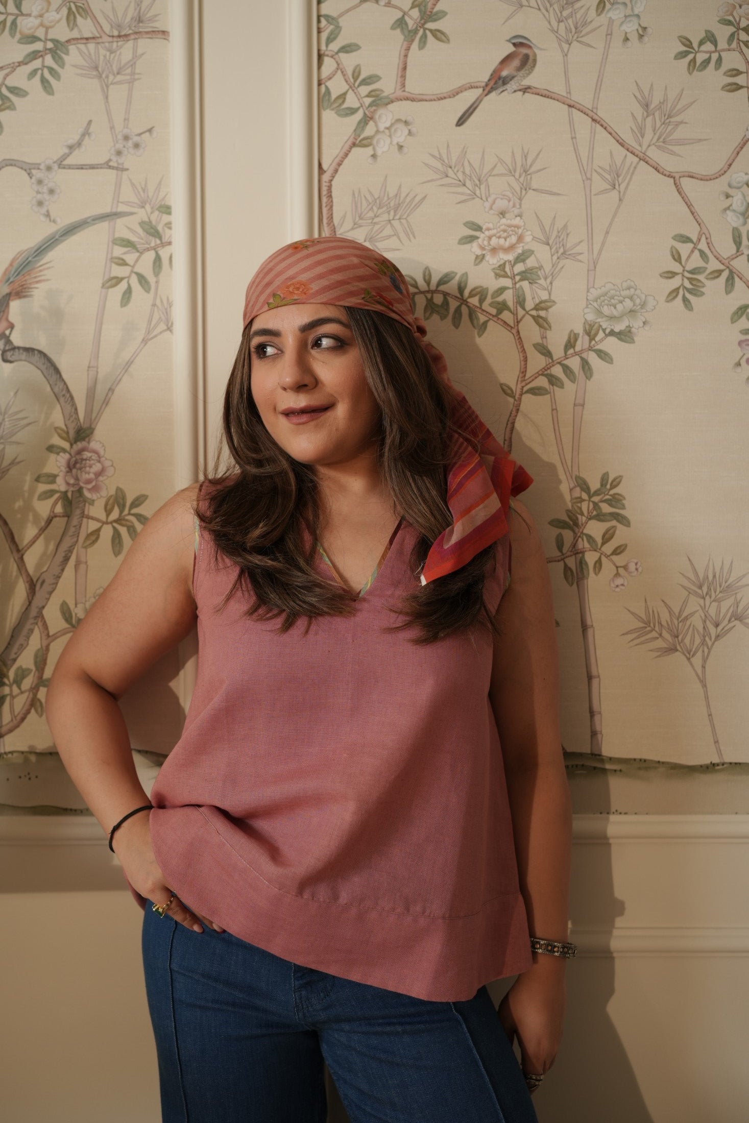 This piece is woven in a breathable cotton-linen blend,this top is a quiet ode to ease. Dyed in a gentle soft pink hue, with a subtle printed stripe trim in taby silk, adding a whisper of contrast character. Lightweight and airy, its designed to move with you.