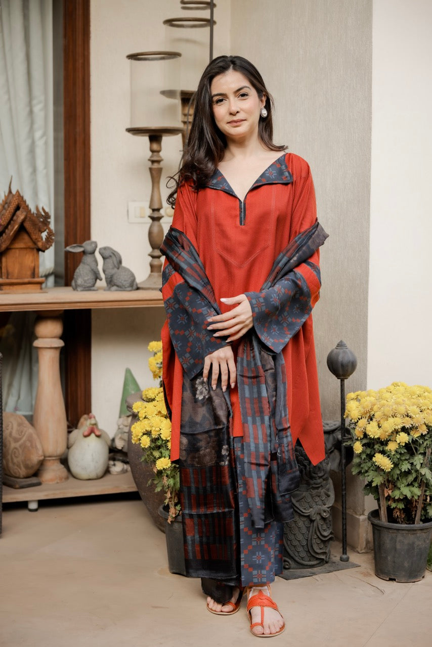 SAAZ a vibrant winter ensemble designed to bring warmth, comfort, and character together. SAAZ a woollen Phirin,soft and falls easy on the body is finished with contrast printed crepe trims that add depth and a playful edge to the silhouette.