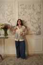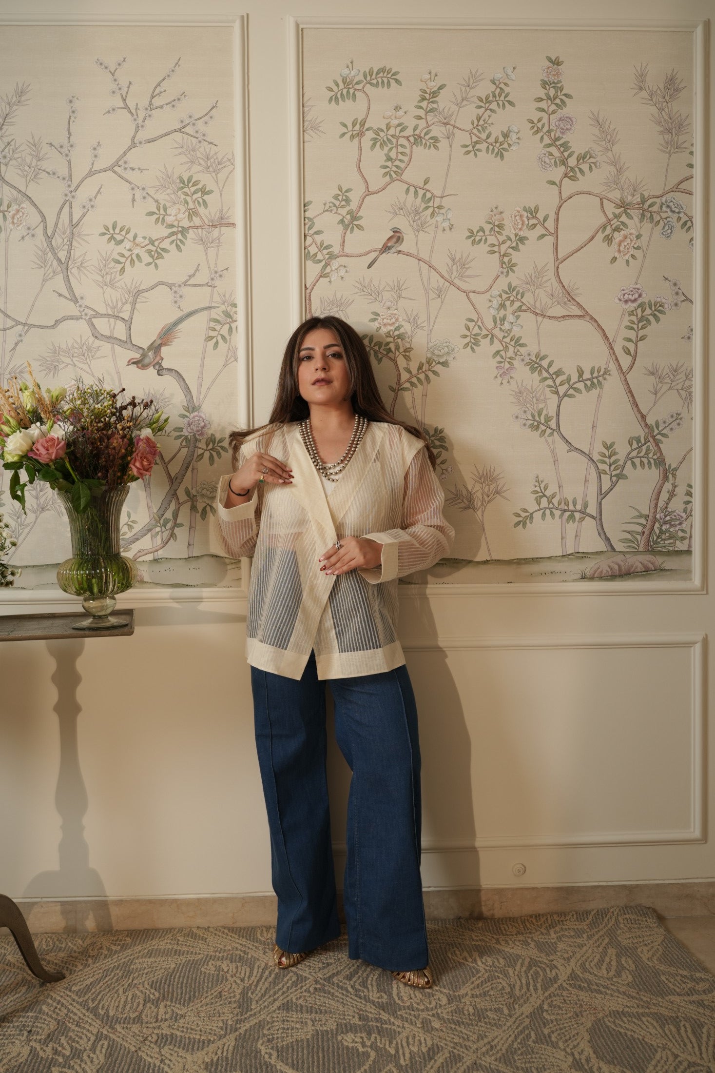 This ensemble is crafted in featherlight woven stripe organza, with a printed inner-slip. sheer delicacy of the fabrics meets the quiets strength of structure, capturing the character of the piece.